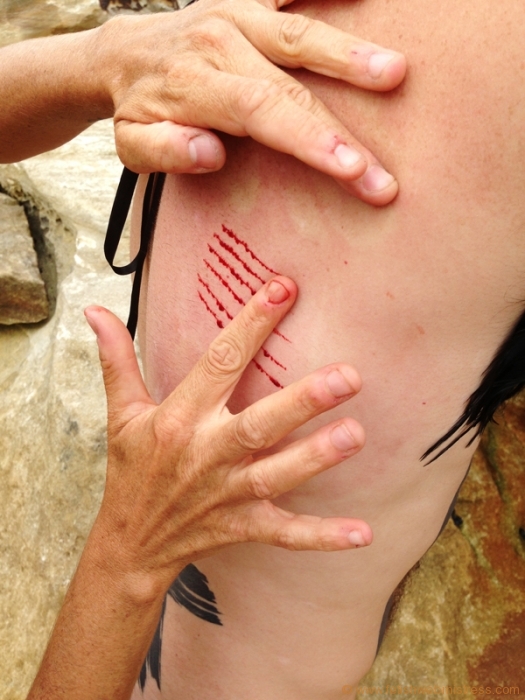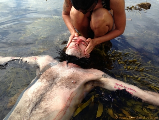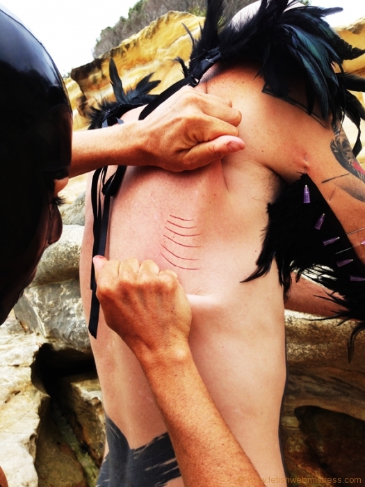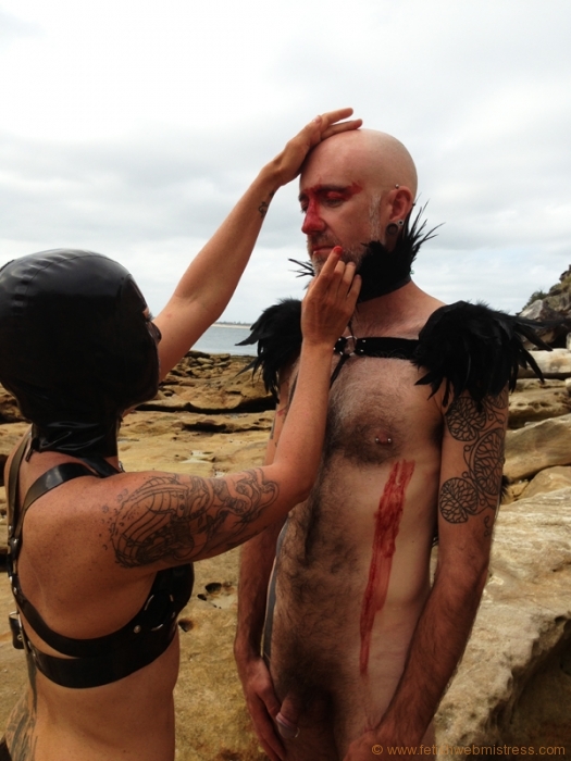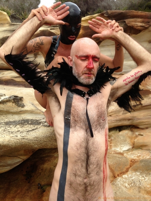 We travelled by ferry to Little Jibbon, a semi-nudist spot on the southern Sydney coast and there they decorated and dressed themselves in feathers and latex and latex hoods and eventually blood and bruises after Charlie went to work on Flip with sharp and stingy things – piercing, cutting, whipping. They exposed themselves to us and the world, literally, and in doing so allowed me to create some truly beautiful photos.